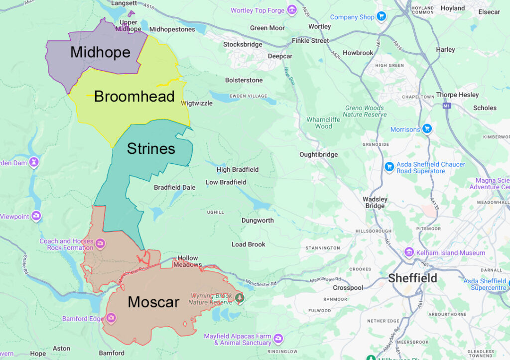 There are four grouse moors which make up much of the land to the west of Sheffield: Moscar, Strines, Broomhead and Midhope. They cover an area of roughly 16,000 acres or over 8,000 football pitches!
